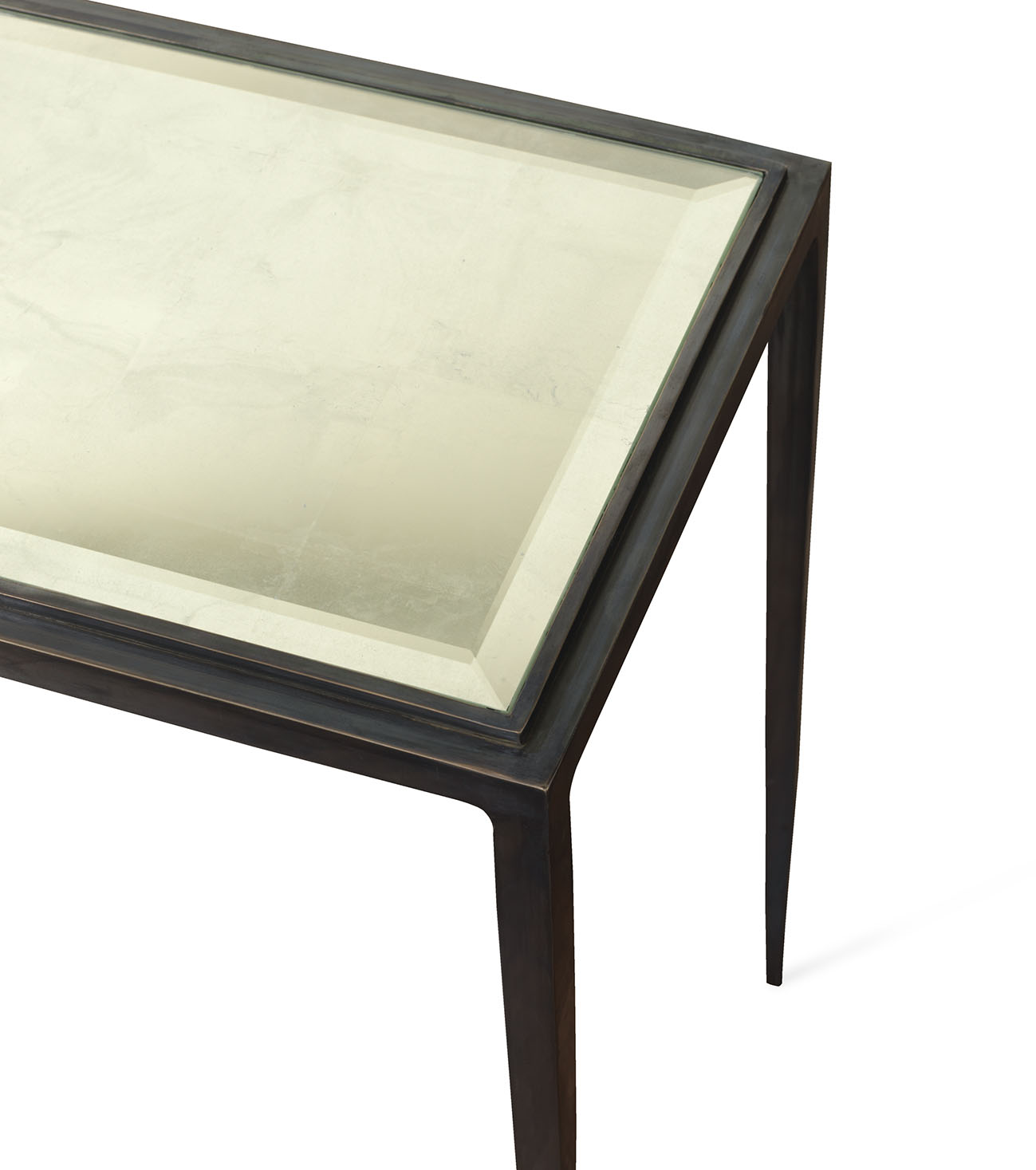 When visitors arrived at Jean-Michel Frank’s Paris shop, they signed a guest book perched on a fashionable little stand in the entryway. It provided the inspiration for the equally chic Avignon Side Table. The frame, available in bronze or wrought iron finish, sports lean legs that taper to a stiletto-like point and bring the table to 20.5” high. The top, 28” deep and 11.5” wide, can be ordered in Clear or Eglomise Mirror, Clear Glass or Honed Black Absolute Granite.