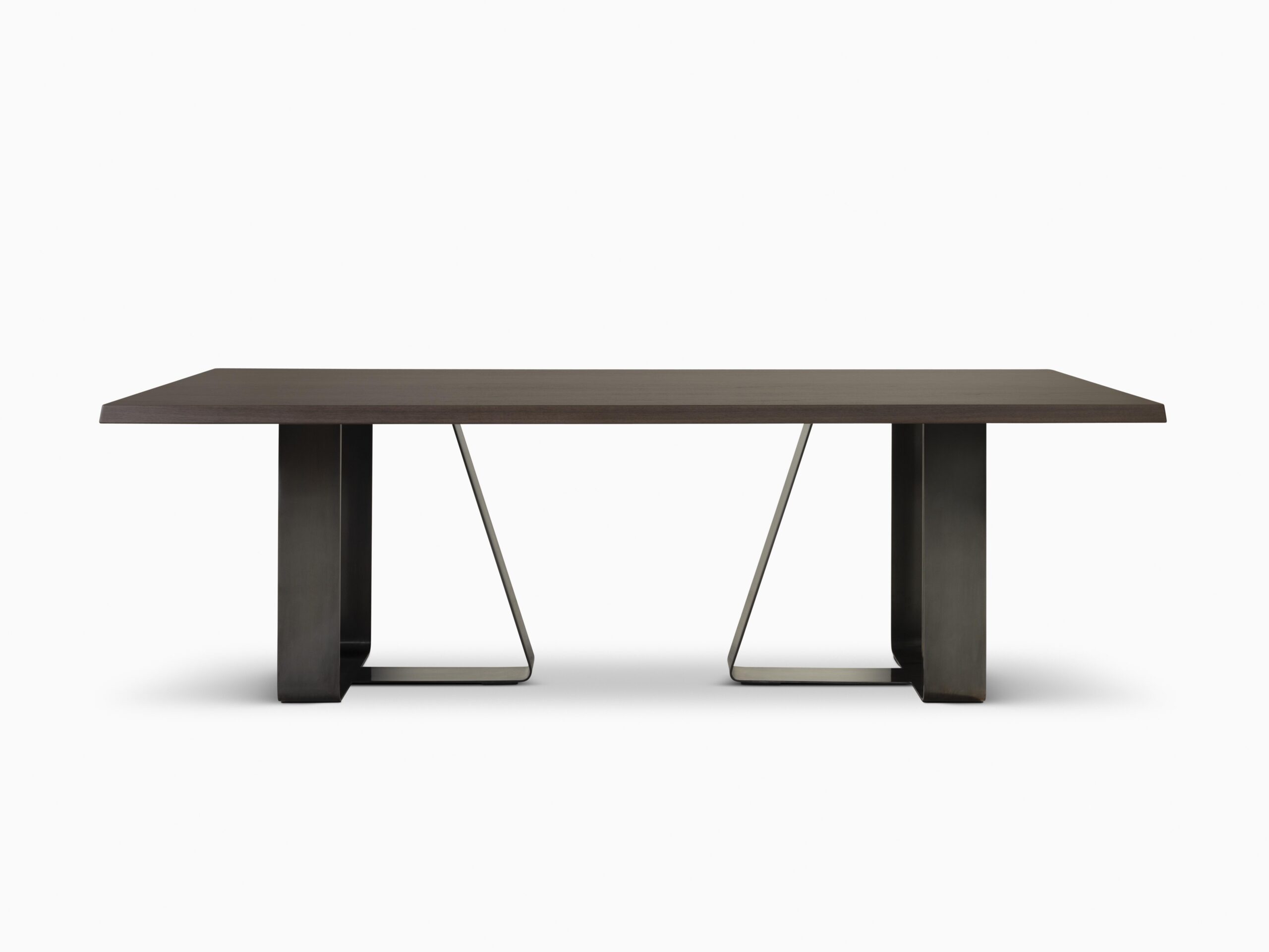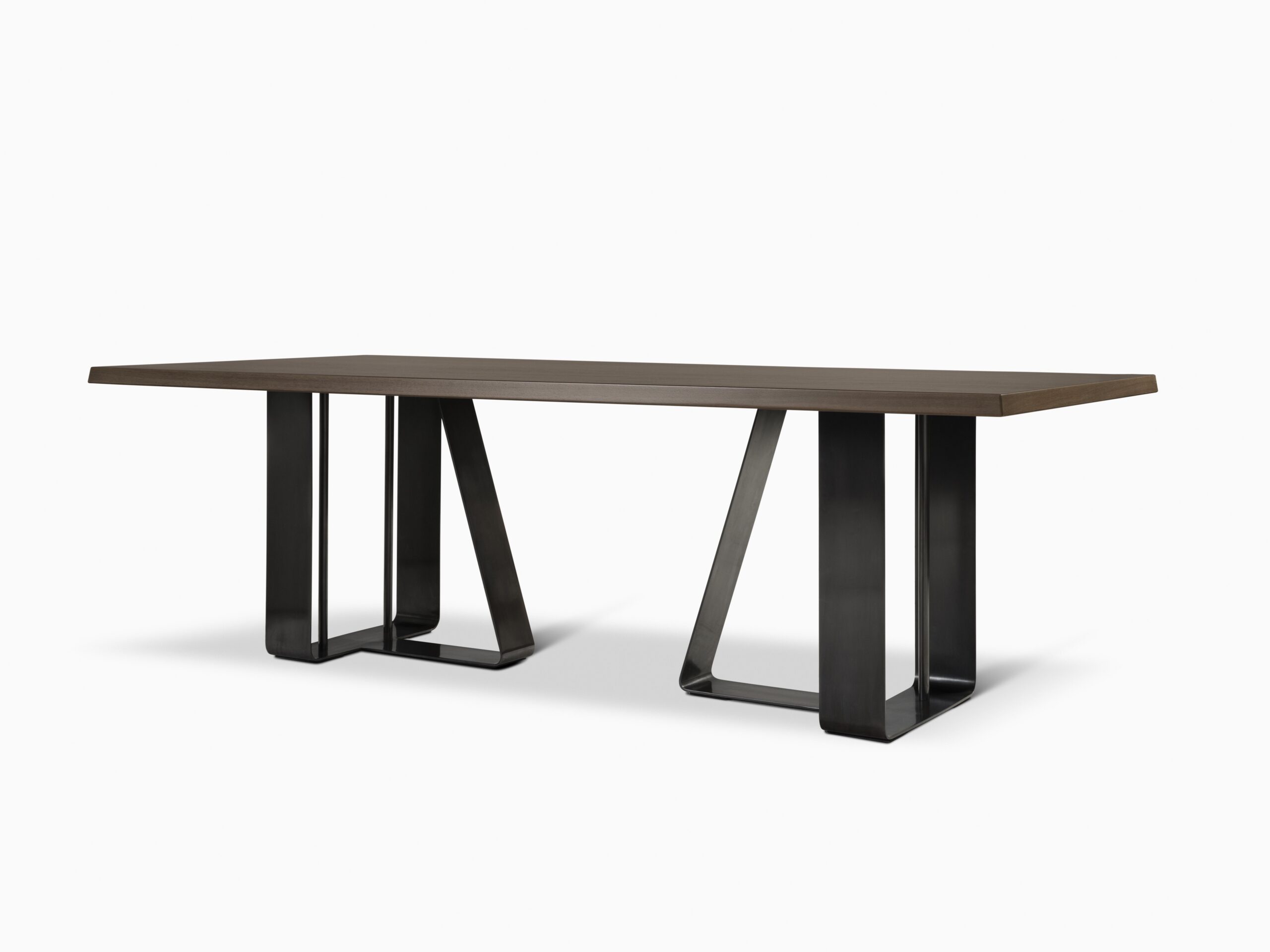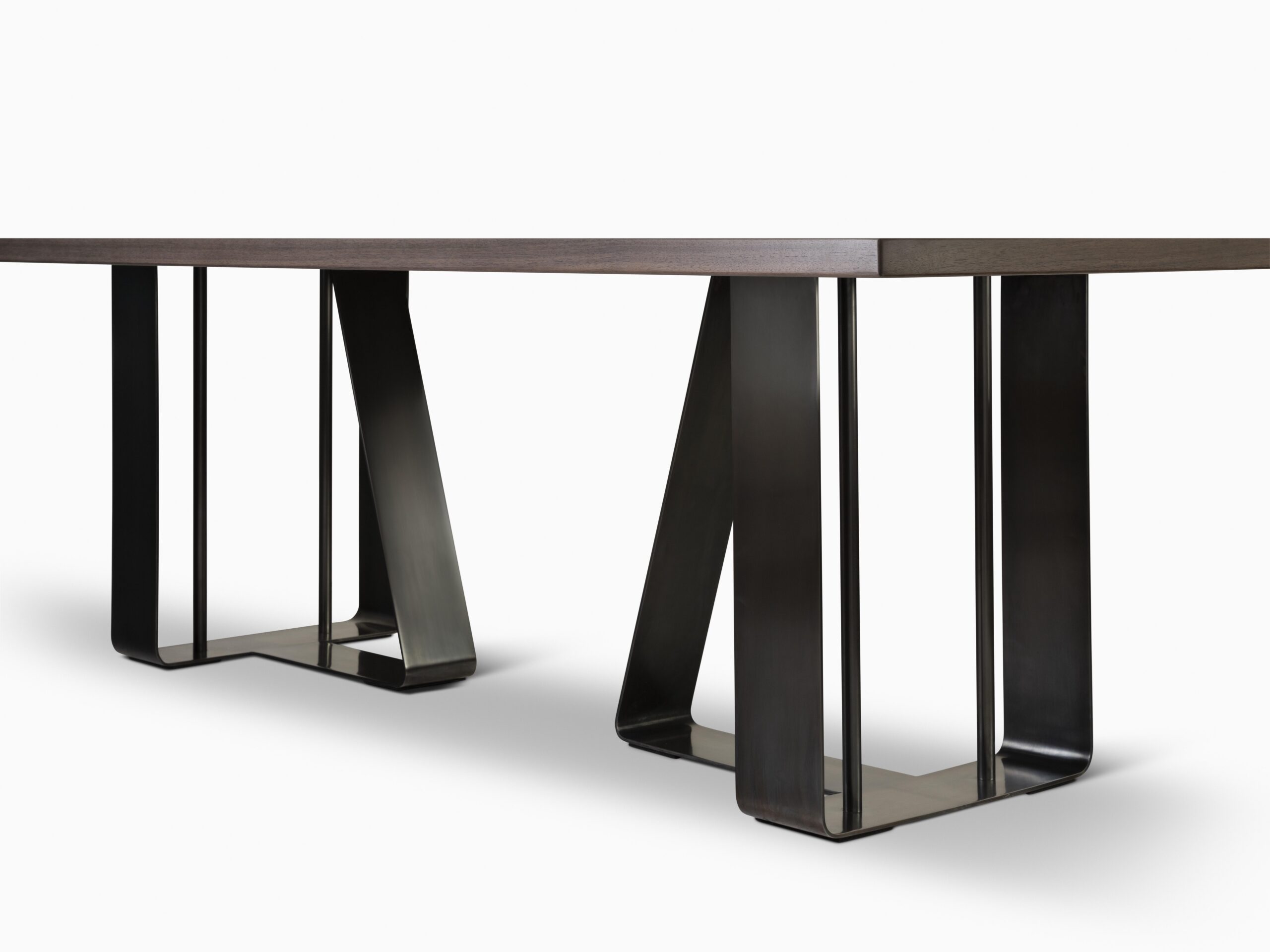 The Crillon Dining Table has polished stainless steel bases with a blue/black finish. It is available with an oak or walnut top in three different sizes.