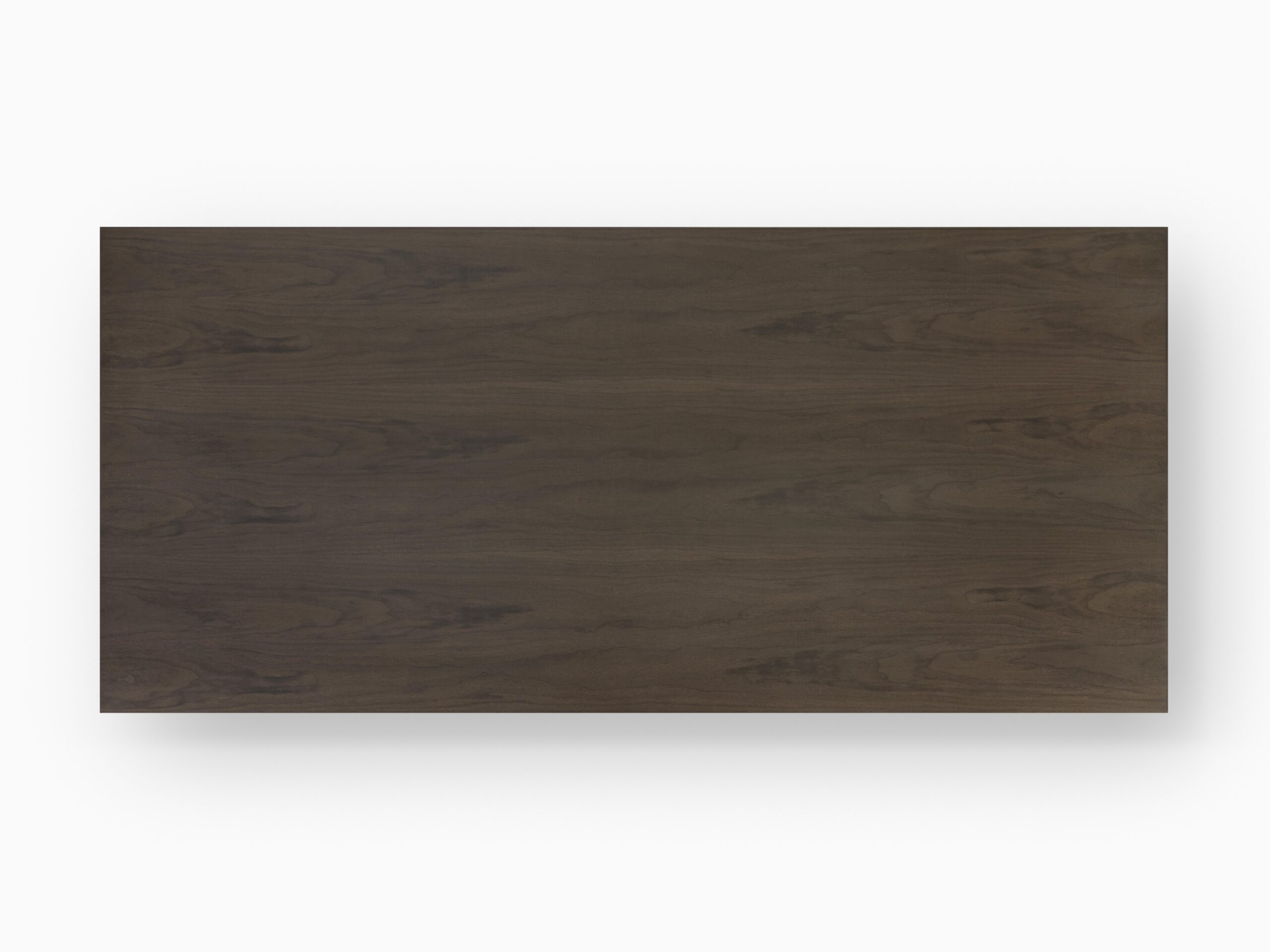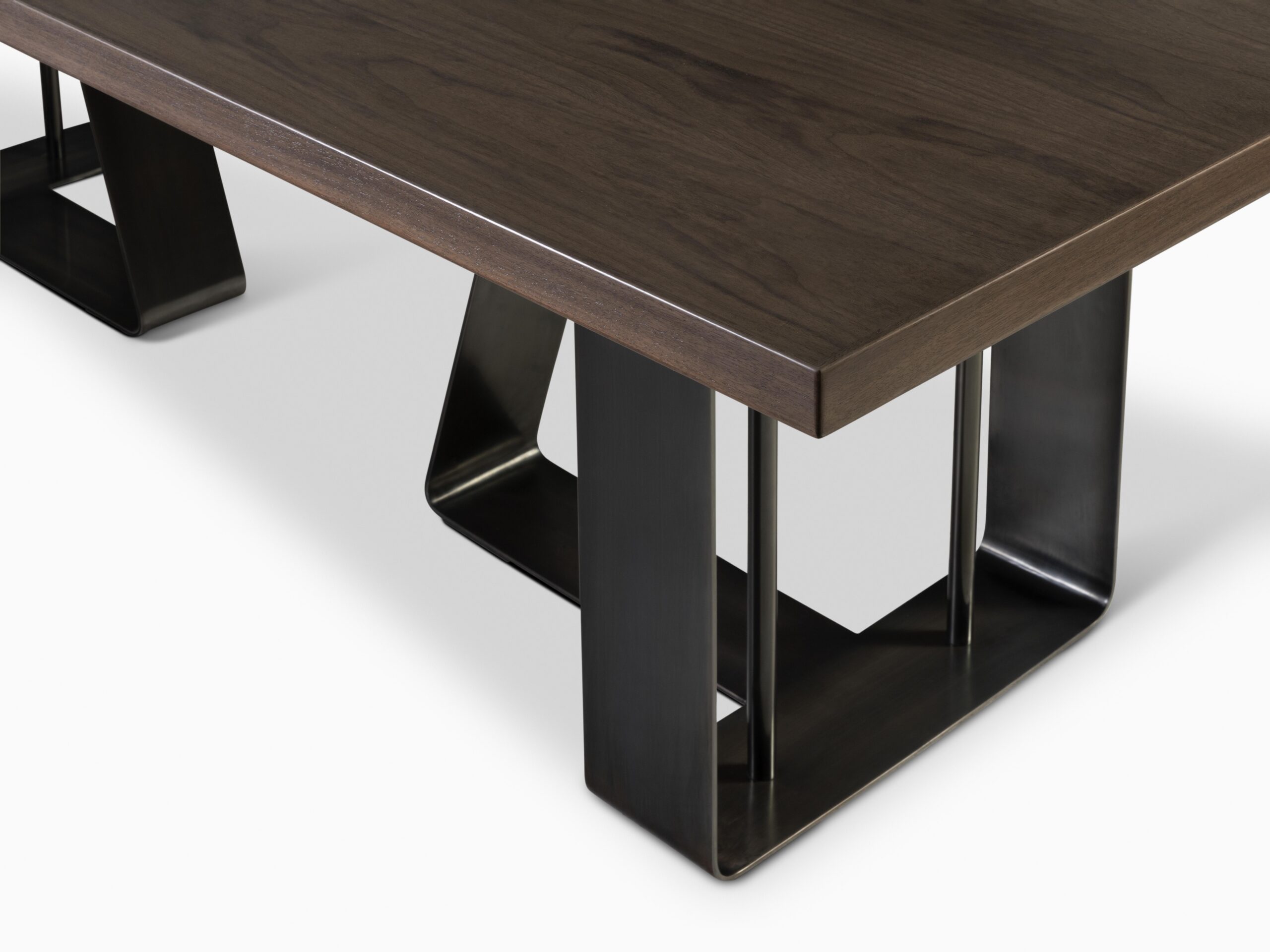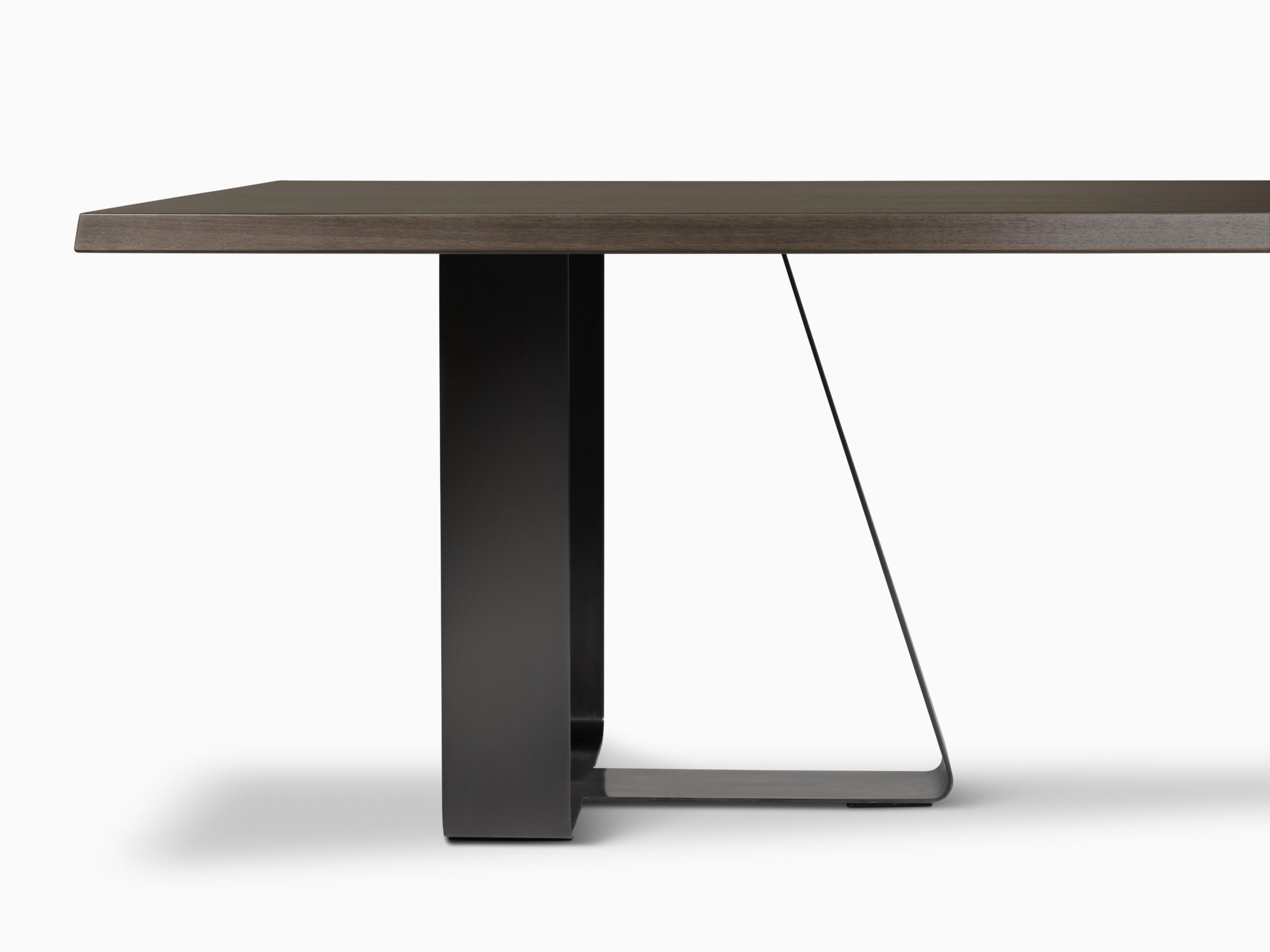 The Crillon Dining Table has polished stainless steel bases with a blue/black finish. It is available with an oak or walnut top in three different sizes.