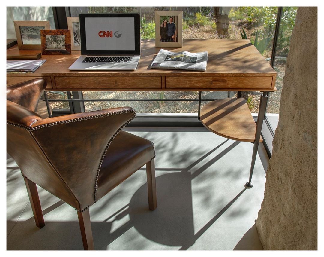 The Elba Desk, a modern take on a classic office design, has storage space aplenty with its three commodious drawers and two ample demi-lune shelves that float beneath. Its delicately drawn wrought iron frame emphasizes the beauty of its solid wood construction.