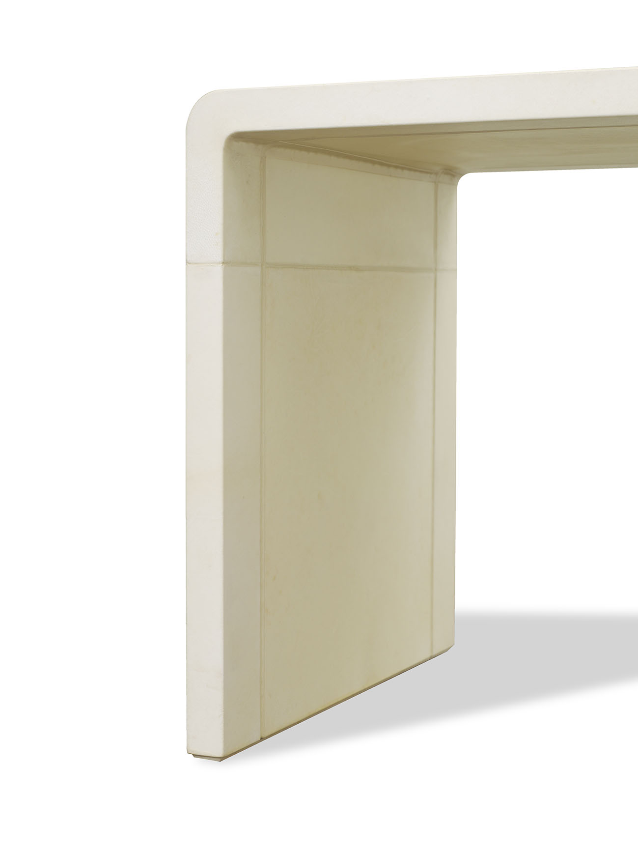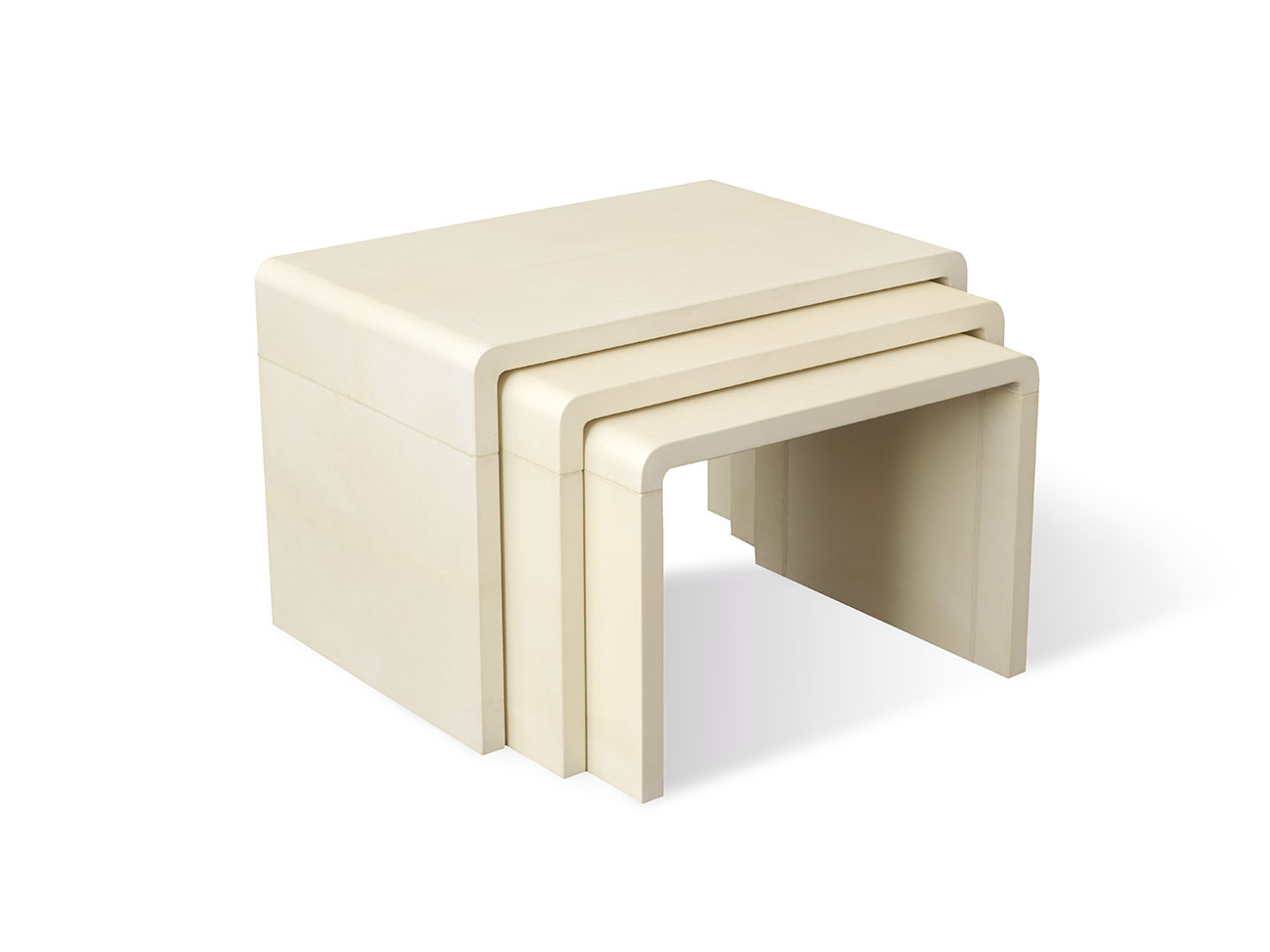 French designer Jean-Michel Frank, famed for his clean-lined furniture covered in sumptuous materials such as shagreen, mica and more, mastered the art of working with vellum (derived from the French veau and originally used to refer to parchment made from calfskin). The Frank Vellum Nesting Tables reference his work, but incorporate manufacturing innovations developed by Mattaliano master craftsmen to ensure the vellums lasting beauty and integrity. All are 16” deep; the largest is 16” high and 24” wide.