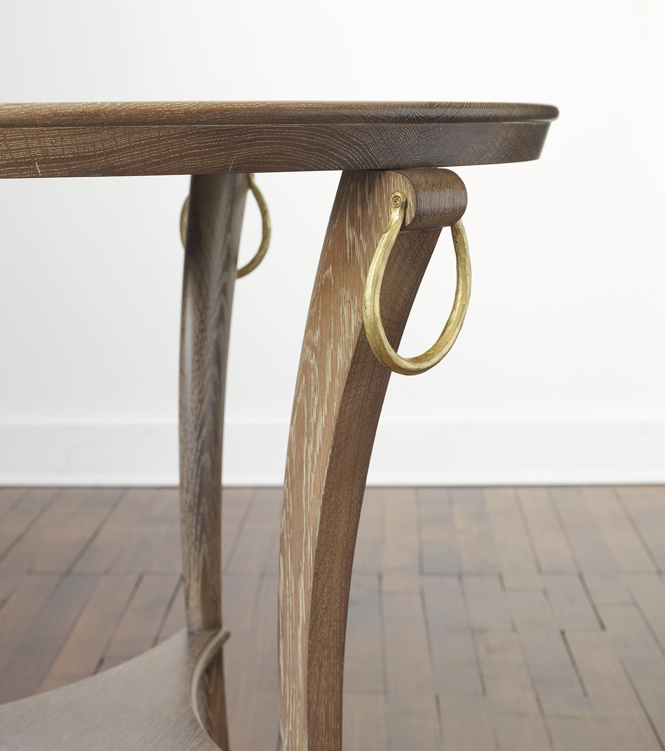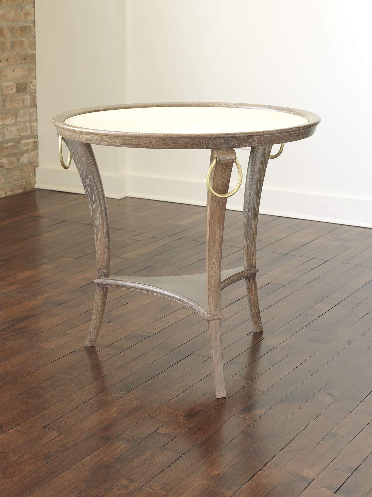 The Subra 3-legged Round Side Table with Vellum Top is an homage to the work of French architect, designer and sculptor André Arbus. Its gracefully curved frame, made in either oak or walnut, is topped with a tray-style table with a vellum inset. Its decorative hardware is available in 22 Karat Yellow Gold Leaf, 12 Karat White Gold Leaf or Blackened Wrought Iron and the table measures 26” high and 28” in diameter.