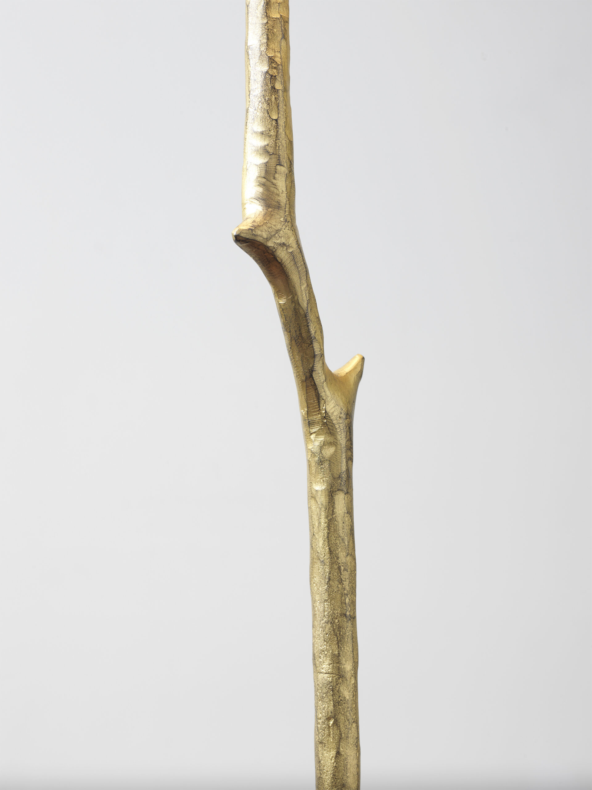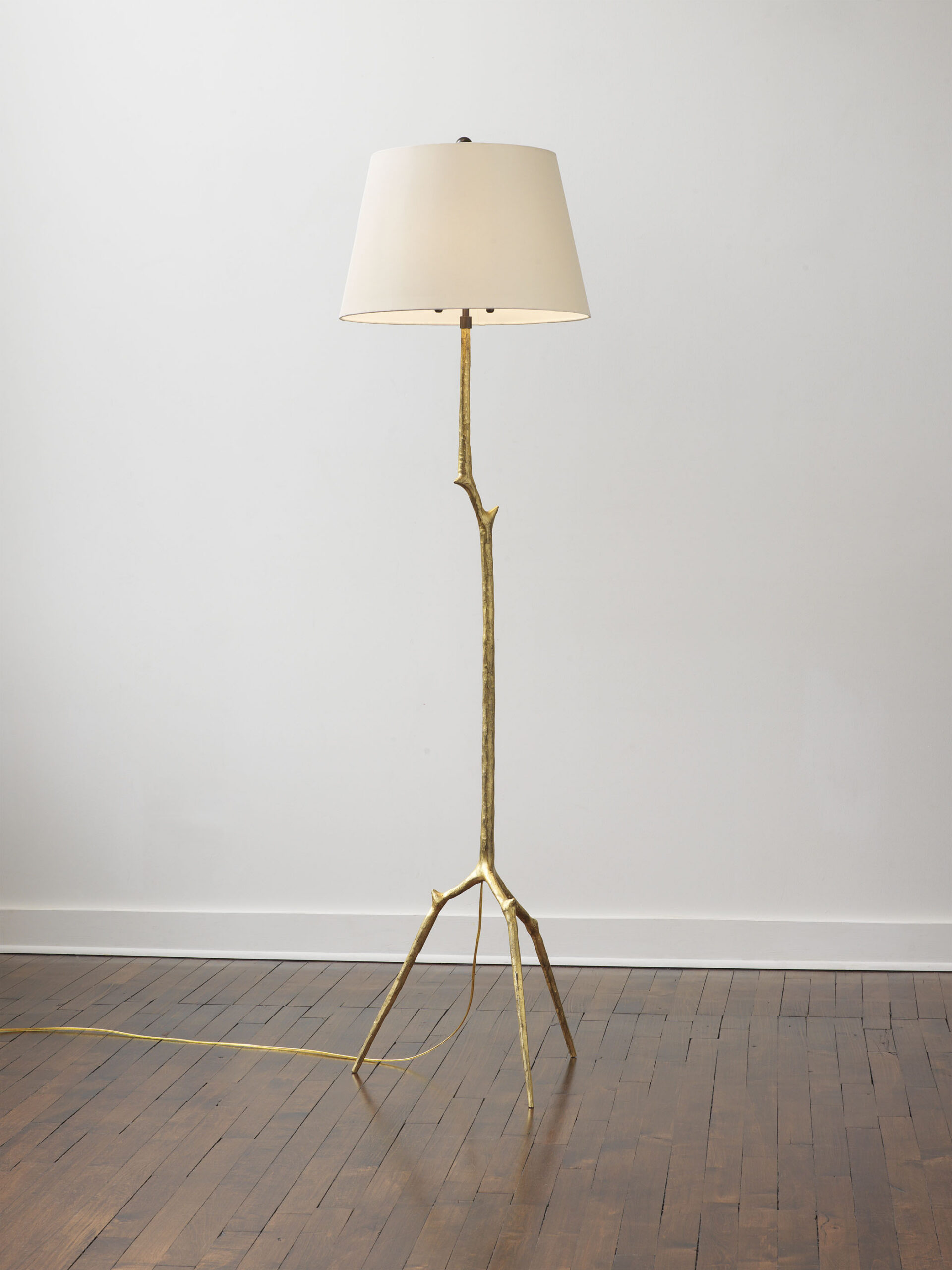 The Trianon Floor Lamp is an homage to the work of Italian designer Felix Agostini, who was known for his elegant bronze and gilt bronze lighting. Its wrought iron fabrication, which requires exacting craftsmanship, exudes sculptural mastery. It stands 67.5” high, comes with an antique brass or gilded spike finial, and is available in three finishes: 22 Karat Yellow Gold Leaf, 12 Karat White Gold Leaf or Blackened Wrought Iron.